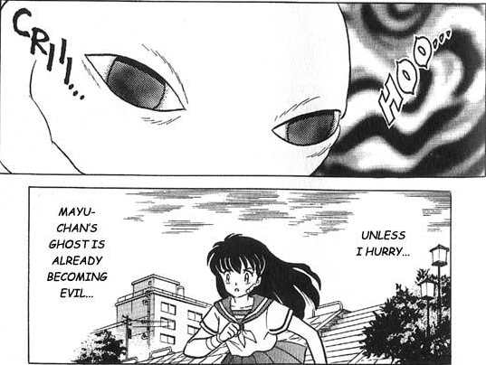 But Kagome says she can't leave Mayu alone, being part of a family of shrine-keepers who should be able to do SOMETHING about the issue. Inuyasha leans his head into the palm of his head, scoffing that he wouldn't even bother, because there's no use in such actions. He looks back to find Kagome has disappeared, and Shippou tells him that she left while he was talking. Rude.