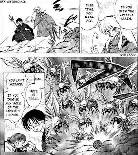 Inuyasha curses Sesshoumaru for knocking Kagome out in the funniest fucking way ever. Sorry, but I'm really not sorry for still thinking it's hilarious. Miroku groans and drags himself next to Inuyasha by his staff, Sesshoumaru commenting casually on how the wasp poison didn't kill him. Raising a trembling right hand, Miroku says he has enough strength to suck Sesshoumaru up with the Kazaana within. After a short pause, Sesshoumaru encourages him to try it and see.