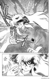 Shippou answering his own questions was another that just bugs me. I get the feeling that in the planning stages of the chapter, RT wanted Miroku to say that it was the new moon, but realized somewhat late that he was unaware of Inuyasha's transformations and it would look cheap if he said it, so the line was given to Shippou instead. It still looks super hokey as a hasty fix, though, so I'm a little peeved by it.