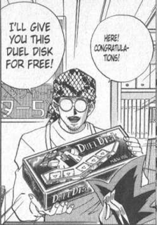 First, Kaiba's give-away of his new technology that he spent time and money developing only makes sense if he's SELLING it to everyone who doesn't make the cut for the tournament. Then he can at least be making SOME of his development money back, but the cashier says that the ONLY people who can get it right now are tournament participants, and for free to boot. If it were really ONLY available to this small subset of the public, then Kaiba would be marking up that price like a motherfucker, but he's not. Why? Because the Duel Disk can't be out of Jonouchi's reach for the next scene to be as visually engaging as Duelist Kingdom