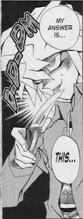 I could talk about how Ryota's offense at Jonouchi's dismissal of the sea and all the deadly surprises it holds, but that's all pretty straightforward too. Something happened to his father and it's really painful for him to hear anyone minimize that issue, even in a peripheral way like in a card game. On the other hand, everyone's deck themes in this manga reflects something serious about their personality and individual struggle, so it's not like Ryota's deck and strategy have NOTHING to do with whatever personal trauma he's dealing with.